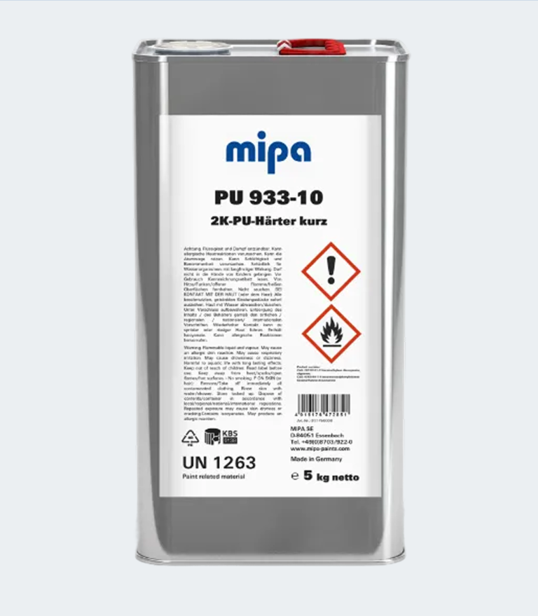 Mipa PU 933-10 is a fast-reacting, two-component polyurethane hardener engineered for use with Mipa 2K polyurethane acrylic paints and primers. It offers an optimal balance between extended open time and rapid curing, making it particularly suitable for coating commercial vehicles and industrial equipment where efficiency and durability are paramount.